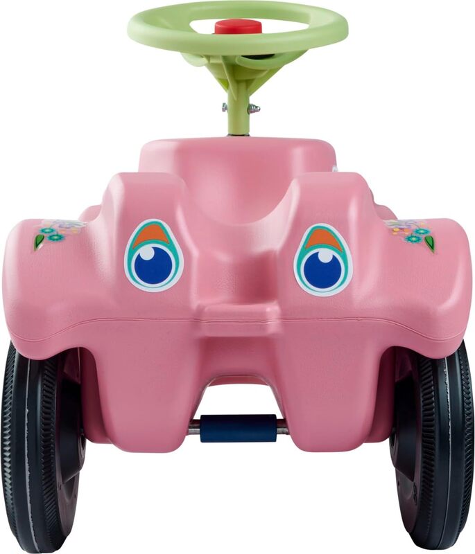 Robustan auto odgurnjača s ergonomskom sjedalicom u ružičastoj boji s cvjetićima za lijepljenje. Volan s mehaničkom sirenom.