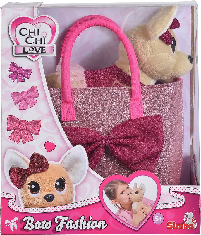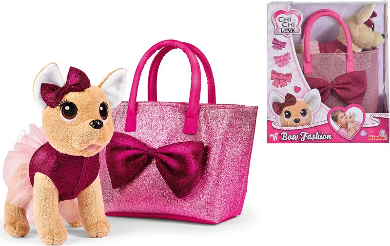 Plišani pas čivava s mašnom u ružičastoj svjetlucavoj odjeći s torbom s mašnom.