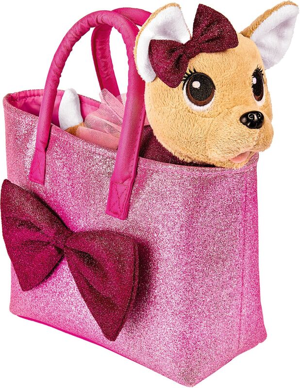 Plišani pas čivava s mašnom u ružičastoj svjetlucavoj odjeći s torbom s mašnom.Veličina je 20 cm.