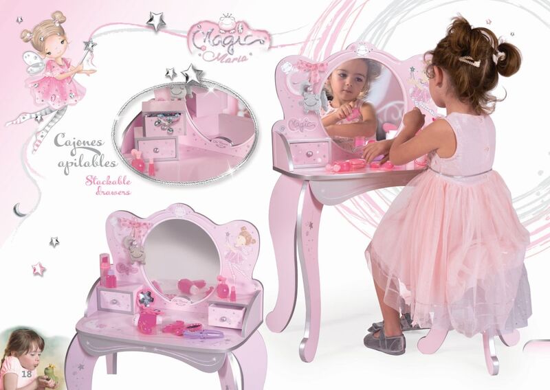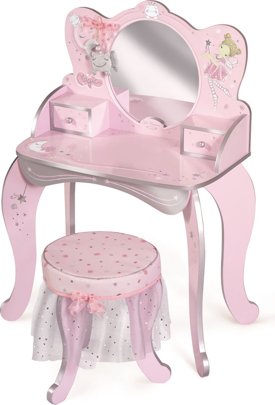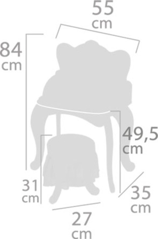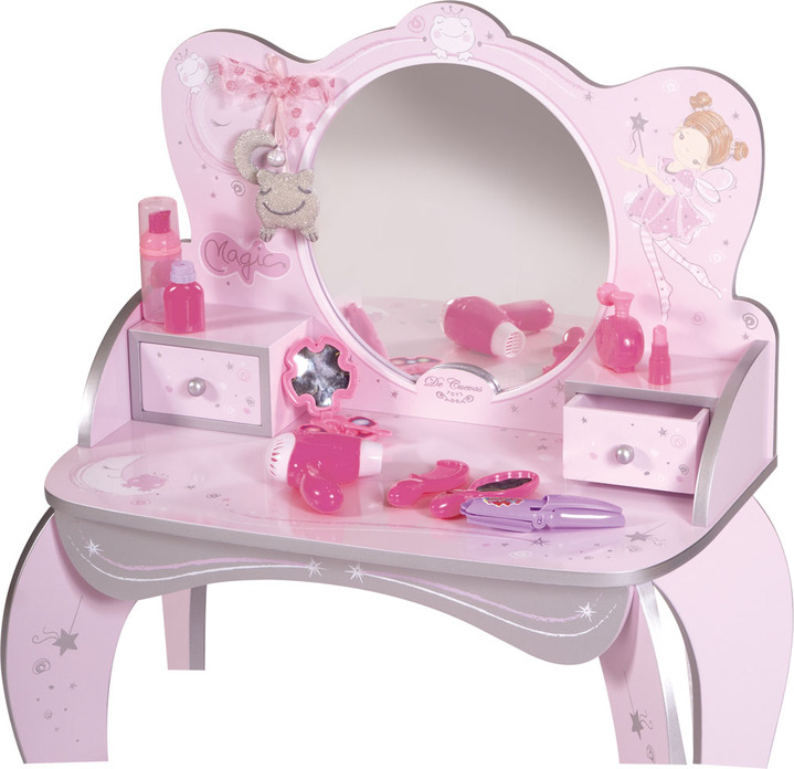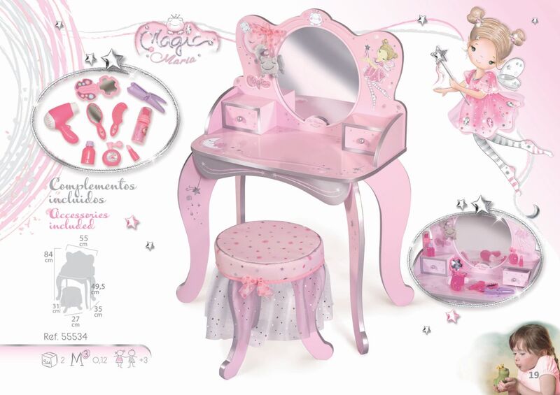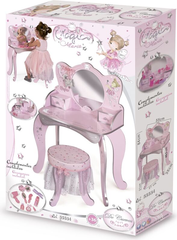 DeCuevas 55534 Drveni toaletni stolić sa zrcalom, drvenom stolicom i dodacima Magic Maria 2020, iz prekrasne ružičasto-srebrne bajkovite kolekcije s vilom, ne bi trebao nedostajati u sobi bilo koje djevojke, u kojoj je mala izložbena djevojka. Prednja strana, daska i noge stola ukrašeni su prekrasnim printom, a sve nadopunjuju ručke na ladicama u srebrnoj boji i mala viseća srebrna japanka s nevenom. Bez stolice s blago svjetlucavim rubnim oblogama sa šljokicama, ovaj set ne bi bio tako bajno čaroban. Prekrasan španjolski dizajn, precizna izrada.Materijal: MDF, masivno drvo, metal, plastika.