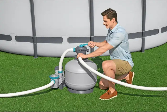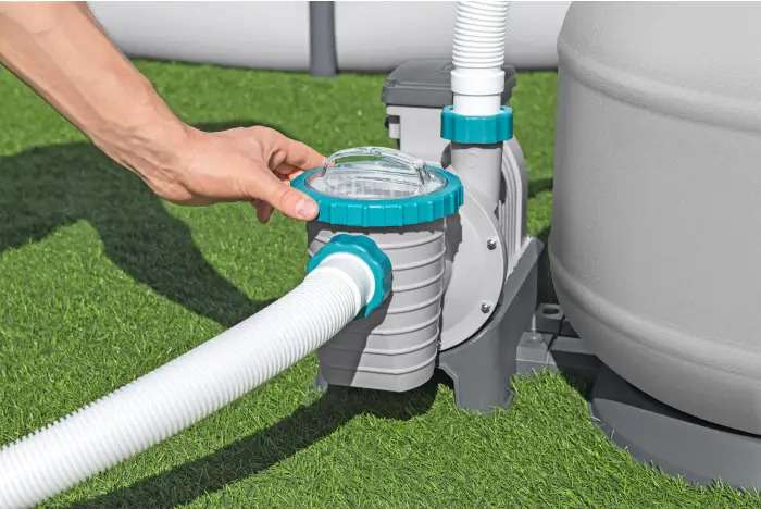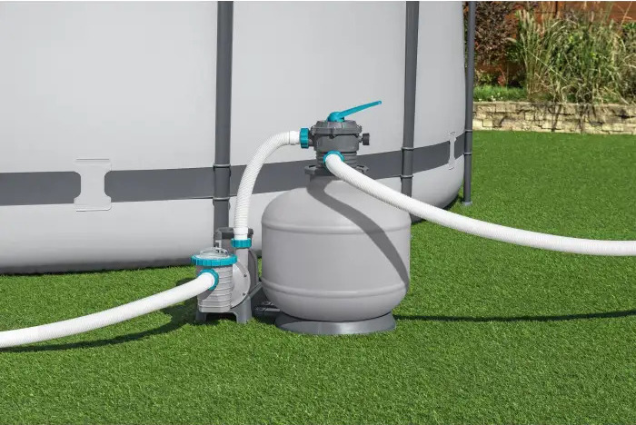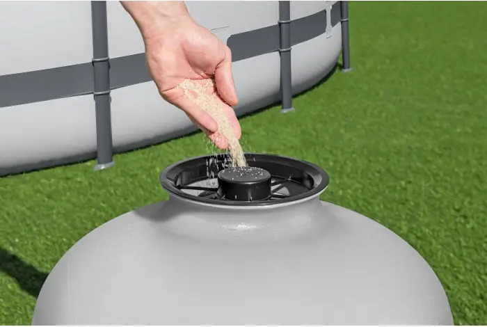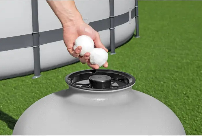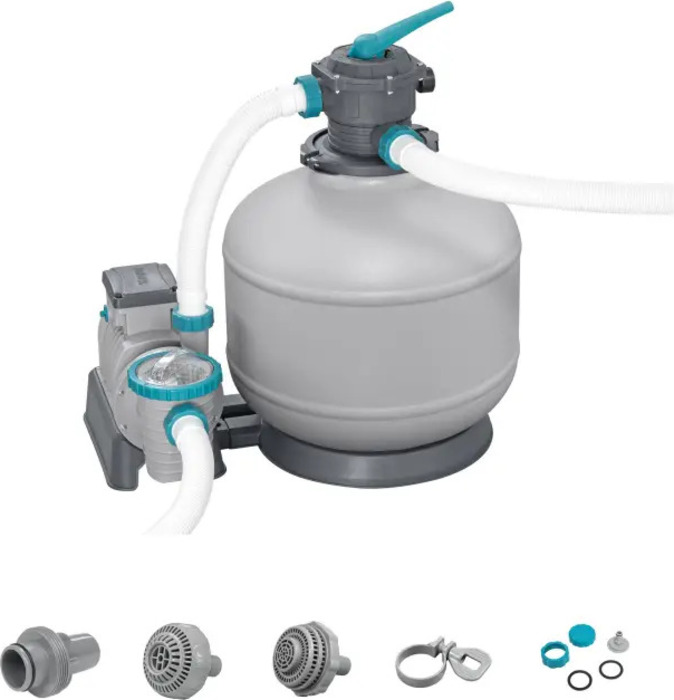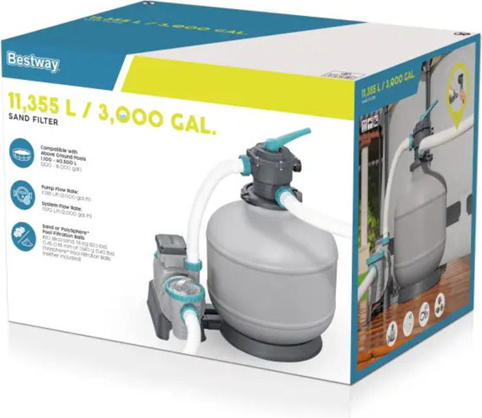 Ovaj proizvod dolazi unaprijed sastavljen i kompatibilan je s većinom 1 100 - 66 600 L iznadzemnih bazena. U paketu se nalazi adapter za bazenske ventile s vanjskim promjerom 3,8 cm. Pijesak nije dio ovog filtra - potrebna veličina pijeska je # 20 silikatni pijesak, 0,45 - 0,85 mm, otprilike 36 Kg. Filter također odlično funkcionira s filtracijskim kuglicama Bestway Polysphere ™.
