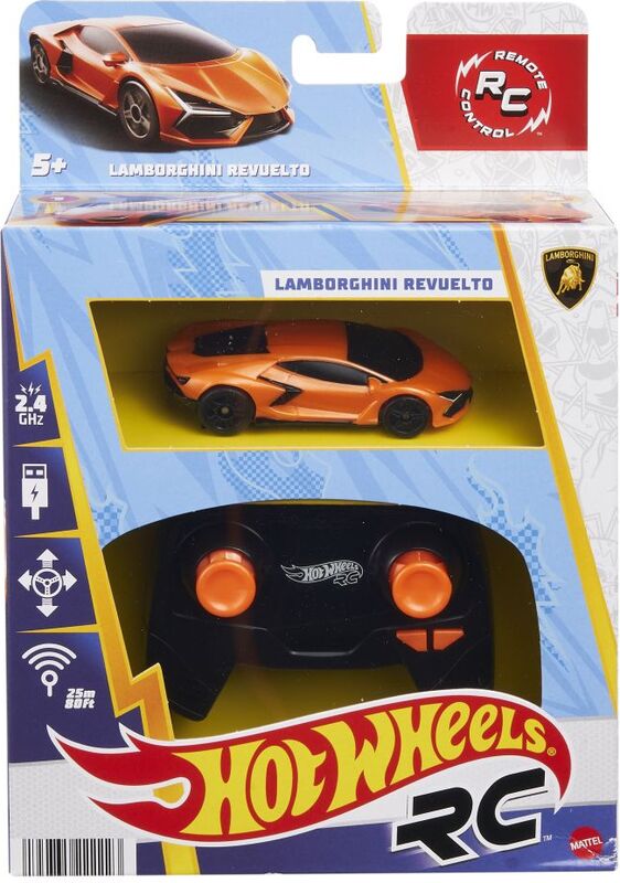 RC auto Hot Wheels daje djeci i kolekcionarima kontrolu nad vlastitim Lamborghini Revuelto. Ova verzija elitnog sportskog automobila u mjerilu 1:64 ima potpuno funkcionalnu daljinsku kontrolu i autentične detalje koje obožavatelji Lamborghini vole. Vozite ga na Hot Wheels stazama ili izvan njih, gdje može dominirati u petljama i prestizati protivnike, a pritisnite gumb turbo boost za dodatnu brzinu prilikom izvođenja kaskaderskih trikova! Boje i dekoracije mogu se razlikovati.