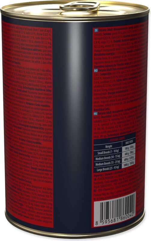 Analitičke komponente Vlažnost 75.00 %; sirovi proteini 13.00 %; sirove masti i ulja 6.00 %; sirova vlakna 0,70 %; sirovi pepeo 2.80%. Dodatne nutritivne tvari na 1 kg Vitamin A 4000MJ; Vitamin D3 130MJ; Vitamin E 130mg; kelat cinka hidroksilnog analoga metionina 200mg; kelat mangana hidroksilnog analoga metionina 40mg; kelatna forma željeza, hidrat 70mg; kelat bakra hidroksilnog analoga metionina 16mg; inaktivirane kvasce obogaćene selenom 1.10mg; DL-Metionin 1000mg; Taurin 500mg; L-karnitin 50mg.