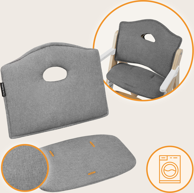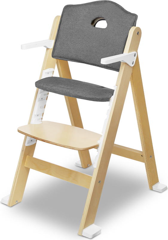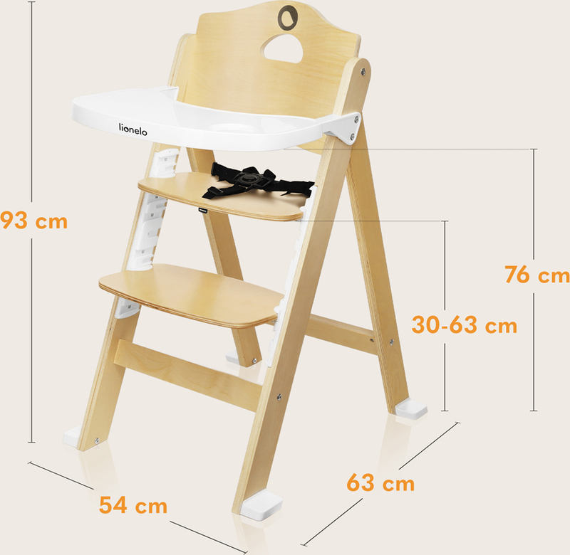 Sigurna drvena konstrukcija: Pettočkovni sigurnosni pojasevi osiguravaju stabilan položaj mališana, a uklonjiva naslonjač za noge pruža čvrstu potporu za noge. Dijete tako prilikom jela održava ispravan položaj sjedenja, što utječe na pravilno funkcioniranje crijeva, kao i na razvoj govornog aparata. Veliki pladanj stvara dovoljno prostora za obroke - idealno za proširenje prehrane pomoću metode BLW. Proizvod je u skladu s europskom normom EN 14988.