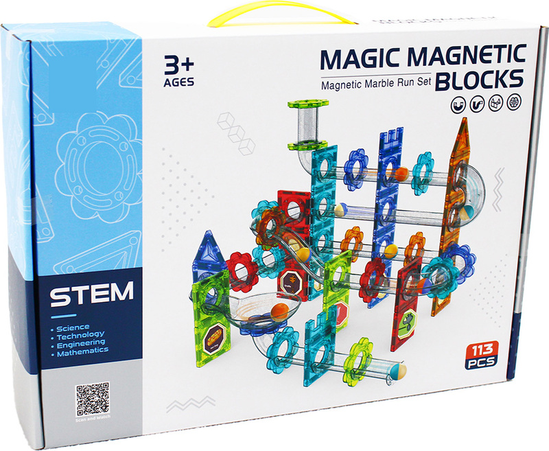 Sadržaj pakiranja: 113 dijelova građevinskog seta (točan broj pojedinačnih dijelova prema slici na ambalaži) Magnetni spojni elementi Kuglice za stazuSigurnosna upozorenja: Nije prikladno za djecu mlađu od 3 godine Sadrži male dijelove - opasnost od gutanja ili udisanja Sadrži magnete - opasno ako se progutaju U slučaju gutanja magneta odmah potražite liječničku pomoć Važne napomene: Prije igre provjerite potpunost i stanje svih dijelova Oštećene dijelove ne koristite U slučaju otkrivanja kvara uklonite ga ili ne koristite igračku Ambalažu čuvajte za daljnju upotrebu