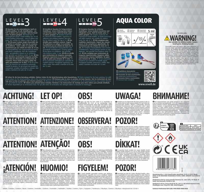 Upute za upotrebu: Vodom razrjediva akrilna boja. Prije upotrebe dobro promiješajte boju. Nanosite kistom ili prskanjem na suhu, čistu površinu. Nezapaljiva baza, brzo se suši – neobojivo nakon 1 sata, potpuno se suši za 2–3 sata, ovisno o debljini sloja. Ako je potrebno, razrijedite vodom. Korištenjem neodgovarajućeg razrjeđivača boja se može uništiti! Čisti se razrjeđivačem Revell Aqua Color Clean. Za prskanje preporučuje se razrjeđivanje maksimalno 20 - 25 %. Kist i pribor odmah nakon upotrebe isperite vodom. Posudu nakon upotrebe čvrsto zatvorite. Nakon otvaranja potrošite što je prije moguće, boja na zraku se suši. Čuvati od smrzavanja. Sadrži Smjesu tvari 5-klor-2metilizotiazol-3(2H)on i 2-metilizotiazol-3(2H)-on s kloridom magnezija i nitratom magnezija. Može izazvati alergijsku reakciju.