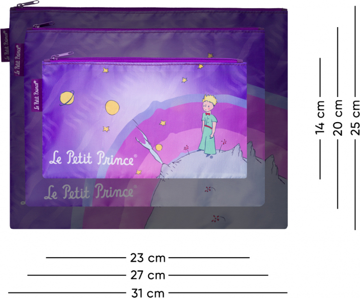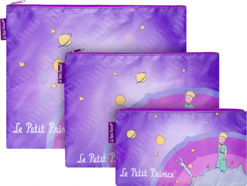 Gdje staviti četkicu za zube, pastu za zube ili ruž? Kako u koferu odvojiti čarape i donje rublje? Imati odmah pri ruci dokumente i druge potrebne dokumente? Imamo sjajno rješenje za vas! Zahvaljujući ovim praktičnim i stilskim torbicama s patentnim zatvaračem u tri veličine, sve imate udobno i brzo pri ruci. Torbice su ukrašene motivom Malog princa. Putujte s radošću i bez stresa! Držite svoj prtljag pod kontrolom.