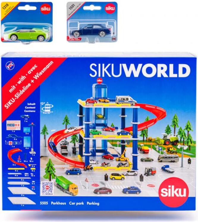 OGRANIČENO IZDANJE - Siku World - Garaža s 2 automobila: Garaža (5505) + Mercedes Benz E350 CDI (1501) + Lamborghini Murciélago Roadster (1318). SIKUWORLD raste. Garaža na 3 kata nudi mnoga parkirna mjesta u svijetu SIKUWORLD. Njegova kombinacija boja uklapa se u dječju sobu.Može se lako integrirati u dva postojeća SIKUWORLD kompleta. Set uključuje narančasti kabriolet Porsche. Garažne staze nizbrdo dovoljno su prostrane, a parkirne kutije numerirane. Lift može odvesti automobil na krov garaže. Vožnja dolje je vrlo brza, jer vozilo ide od gornjeg kata do izlaznih vrata bez zaustavljanja.