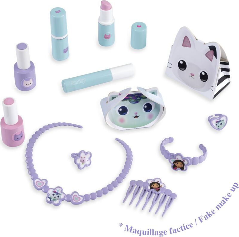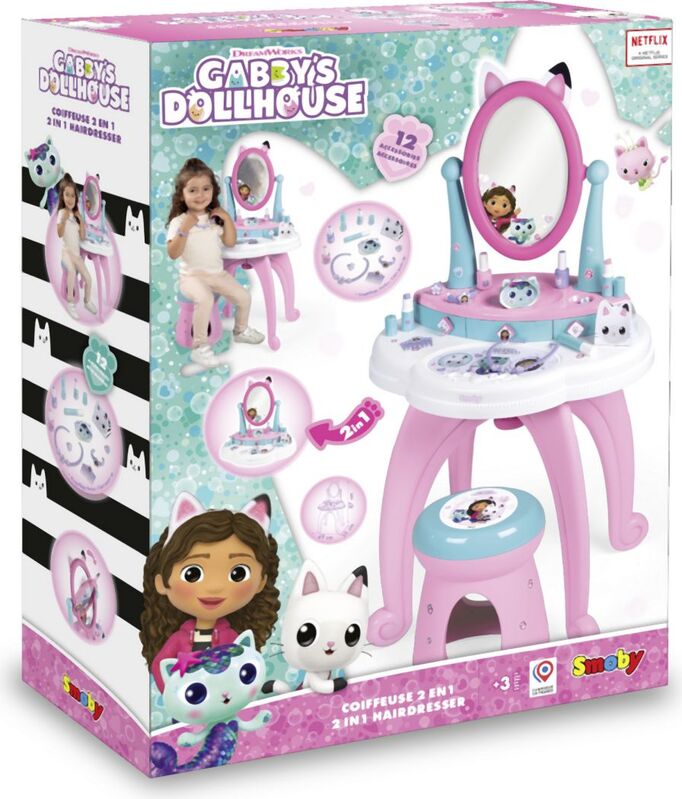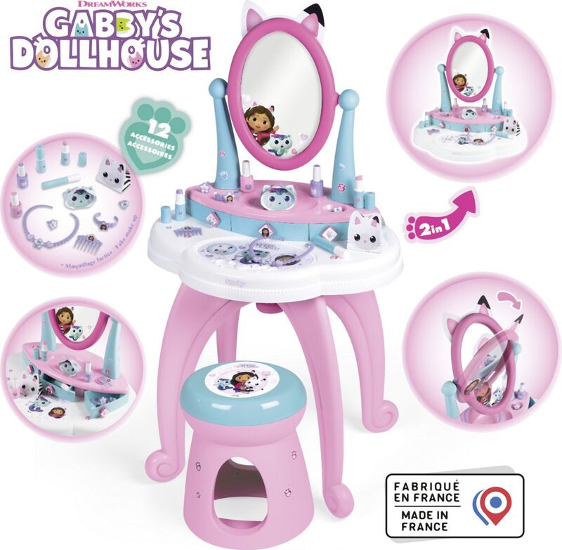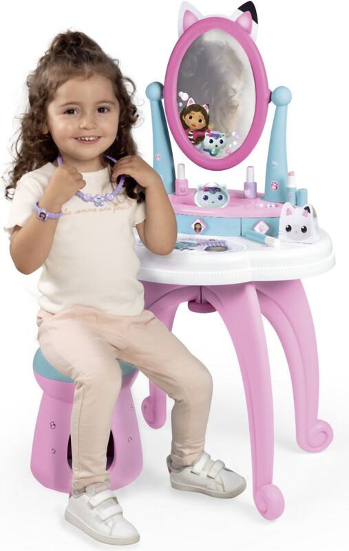 Za male ljepotice tu je stylish toaletni stolić u dizajnu Gabby´s Dollhouse, koji očarava svojim sjajnim učinkom. Ovaj stolić nudi više od 10 komada pribora uključujući traku za kosu, češalj, prstenje, lak za nokte, ruž i druge dodatke. Uključeno je podesivo ogledalo i udobna stolica s nosivošću do 50 kg. Toaletni stolić se može odvojiti od nogu i postaviti na stol.
