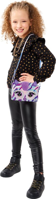 - Aktivirajte do 30 različitih zvukova i reakcija dodatnim dodirima. Izrađena je od sjajne srebrne lakirane tkanine s promjenjivim ljubičastim prugama, ima lepršavu grivu, metalne dodatke i podesivi remen.
