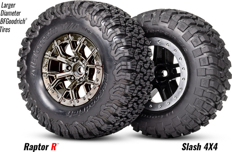 Licencirane gume BFGoodrich All-Terrain T/A KO2 su 5 mm više od standardnih guma na modelu Slash, kako bi oponašale izgled i agresivne stavove Raptora R. Replika kotača Ford s imitacijom Beadlock ima isti vanjski promjer od 2,2” i unutarnji promjer od 3” kao obični kotači za modele Short Course. Nosač je šesterokut 12 mm.