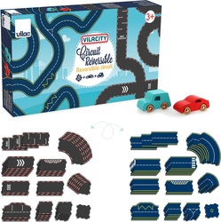 U pakiranju se nalaze dva drvena autića koja se mogu voditi po stazi, natjecati s njima ili stvarati vlastite prometne priče. Lagani, ali čvrsti karton omogućuje lako sklapanje i ponovnu montažu, čime se prirodno razvija koordinacija pokreta i fina motorika.
