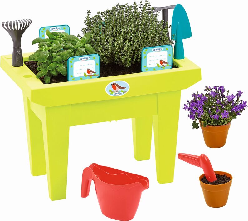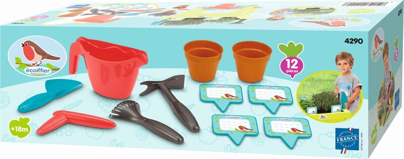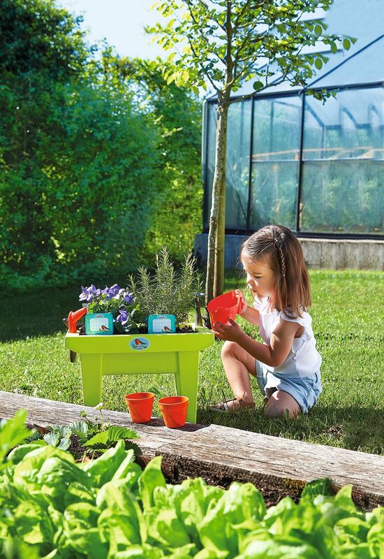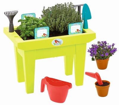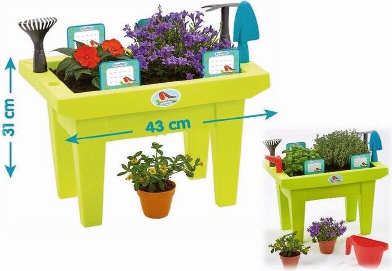 - Uključuje mnoštvo dodataka kao što su grablje i lopata, motika, kolac za sadnju, posuda za cvijeće, kolac, 4 etikete i 2 posude za cvijeće. Vrtni alati idealni su za kopanje, plijevljenje, rahljenje tla i sadnju sadnica. Svi dijelovi su lijepi i veliki, laki za držanje i bez oštrih rubova, tako da su savršeni i za male dječje ruke.
